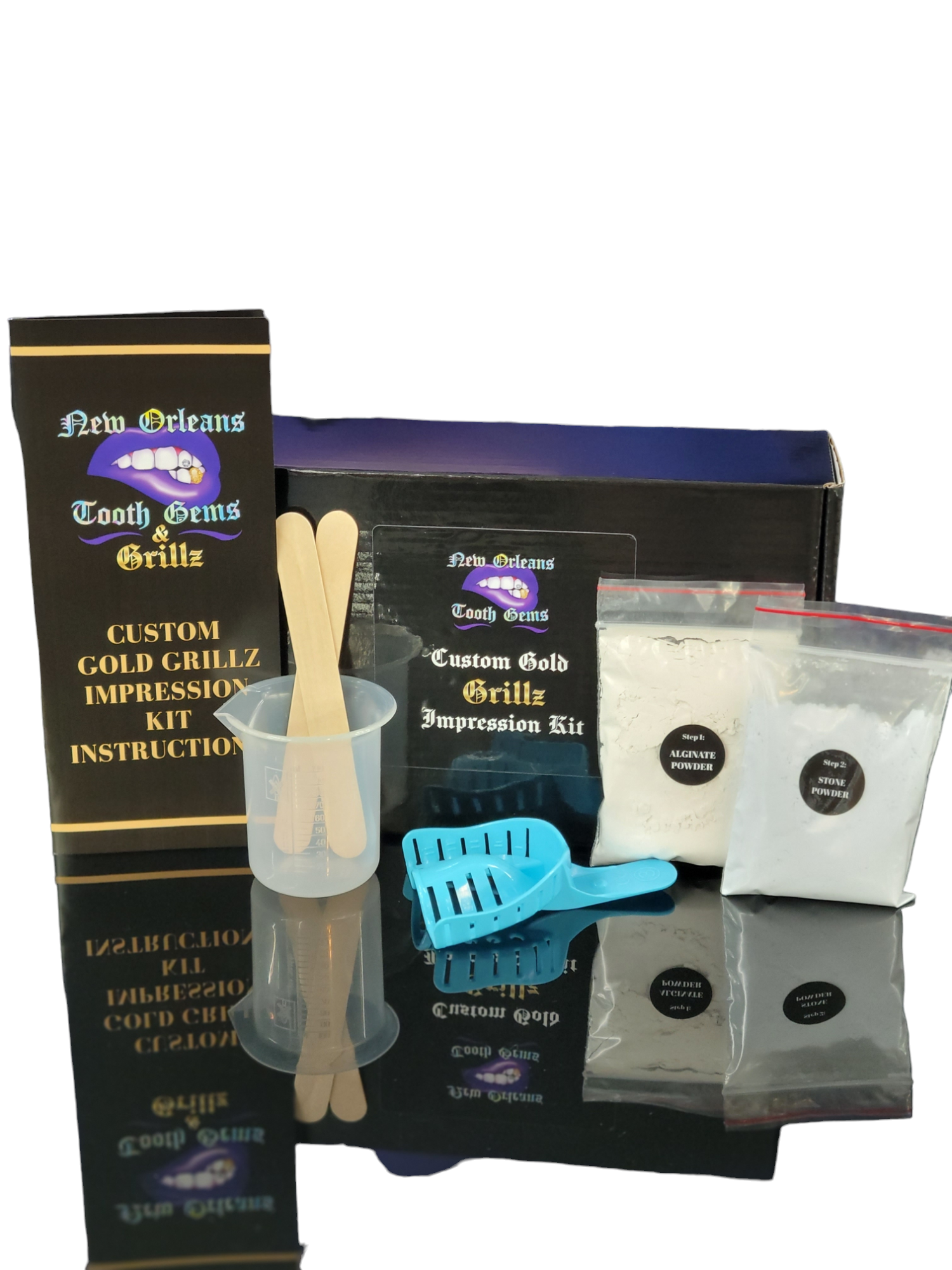 The New Orleans Tooth Gems Custom Gold Grillz Impression Kit is a convenient and easy-to-use solution for creating unique and stunning Custom Gold Grillz. With high-quality materials and a precise molding process, this kit ensures professional results every time. Choose this Impression Kit if you are getting your grillz on the TOP TEETH ONLY. Includes step-by-step instructions, mouth tray for TOP TEETH ONLY, mixing sticks, measuring cup and powder.
